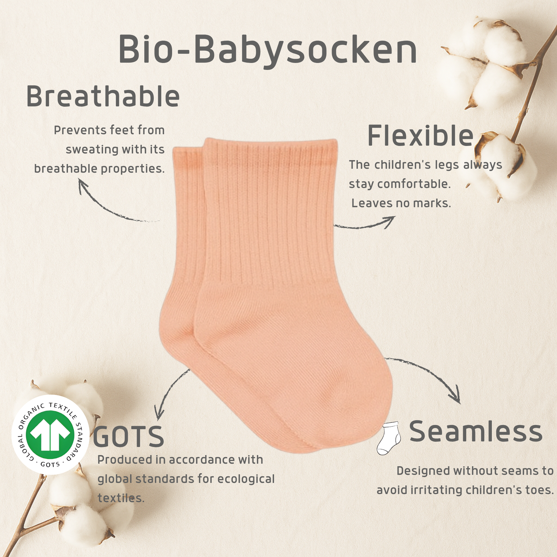 Die bistyle Babysocken sind GOTS-zertifiziert und damit perfekt für die sensible Haut deines Babys geeignet. Durch die Verwendung umweltfreundlicher Materialien und eine nachhaltige Produktion bieten wir dir nicht nur höchste Qualität, sondern auch ein gutes Gewissen. Mit jedem Kauf trägst du dazu bei, unsere Umwelt zu schützen und faire Arbeitsbedingungen zu unterstützen.