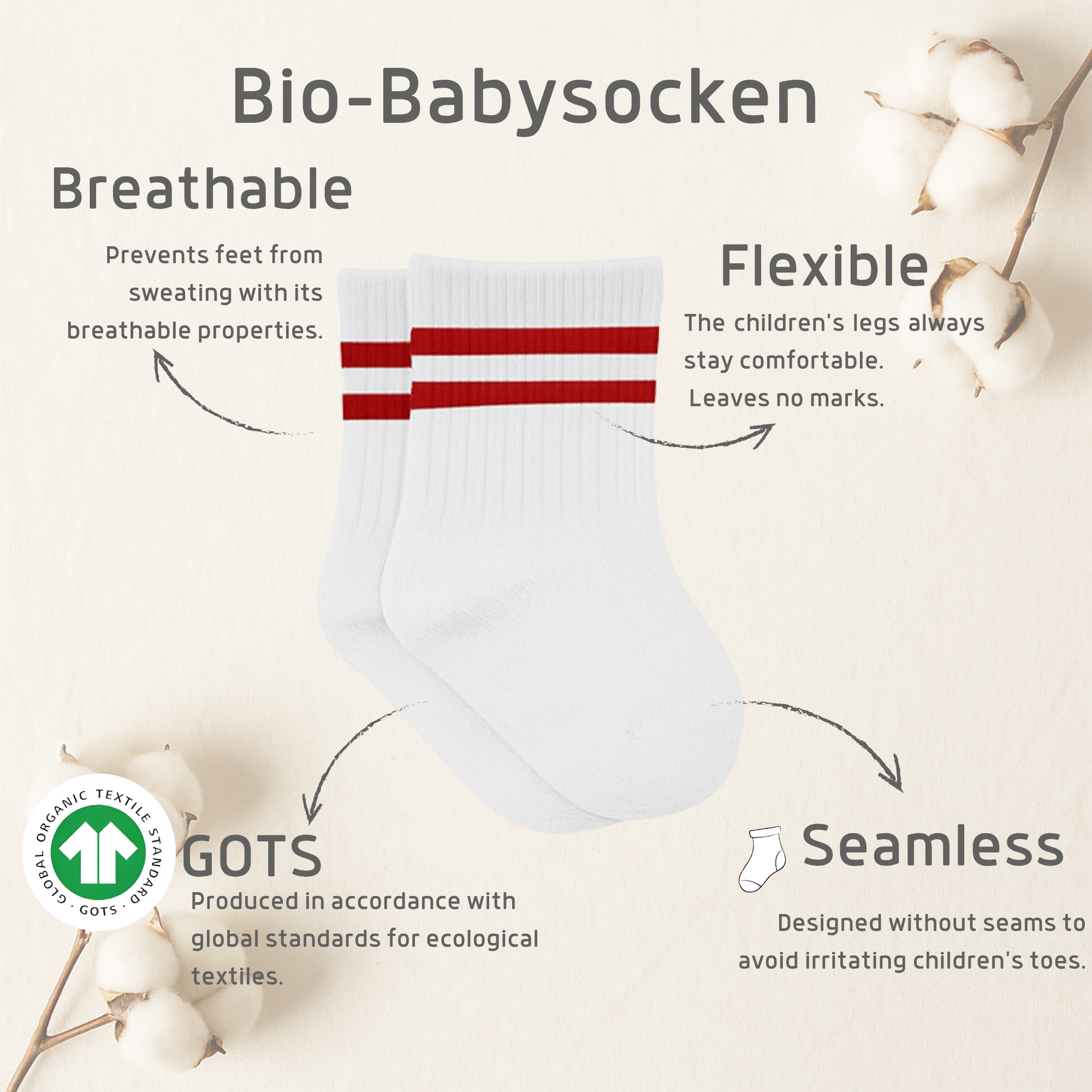 Die bistyle Babysocken sind GOTS-zertifiziert und damit perfekt für die sensible Haut deines Babys geeignet. Durch die Verwendung umweltfreundlicher Materialien und eine nachhaltige Produktion bieten wir dir nicht nur höchste Qualität, sondern auch ein gutes Gewissen. Mit jedem Kauf trägst du dazu bei, unsere Umwelt zu schützen und faire Arbeitsbedingungen zu unterstützen.